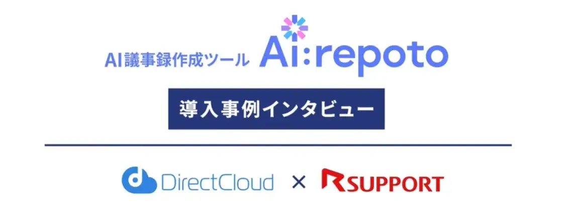 AI×DXで革新するリモート総合ソリューション企業であるRSUPPORT株式会社(本社:東京都港区、代表取締役:徐 滎秀(ソ・ヒョンス)、以下「RSUPPORT」)は、クラウドストレージサービスを提供する株式会社ダイレクトクラウド(本社:東京都港区、代表取締役 :安 貞善、以下「ダイレクトクラウド」)が、AI議事録作成ツール「Ai:repoto(エイアイレポト)」を導入し、議事録作成工数を大幅に削減、案件の進行速度と顧客対応件数を向上させた導入事例を公開したことをお知らせいたします。