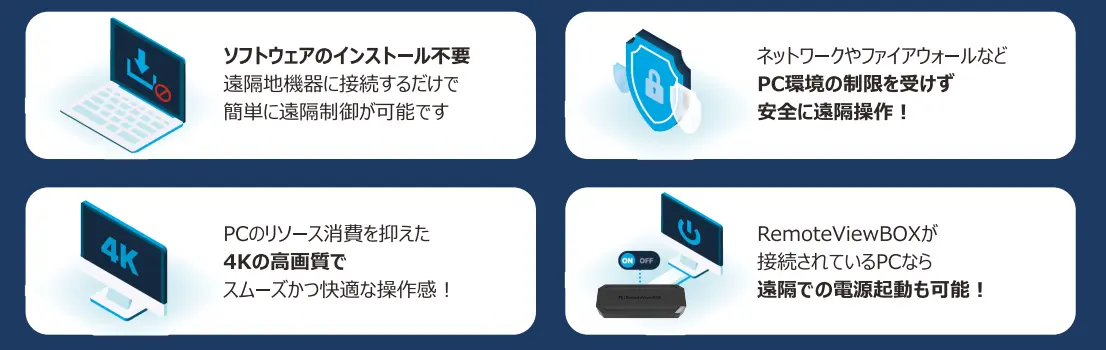 RemoteViewBOXは、遠隔地PCへのプログラムインストール不要で、USB(キーボード・マウス)とHDMIケーブルをRemoteViewBoxに接続するだけで、どこからでもスピーディで安全に、すぐにリモートアクセスが可能になるハードウェアデバイスです。