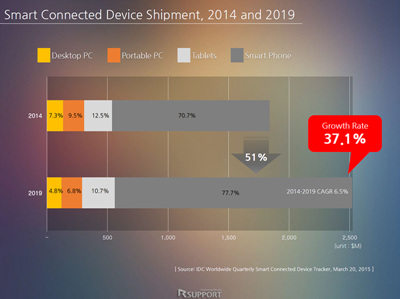 그렇다면 원격은? 디바이스의 증가 디바이스간 연결 폭발 원격을 통한 지원 증가로 귀결되어 2019년까지 무려 87.8%의 Remote Support 시장이 확대될 것이라 IDC는 예측하고 있습니다.