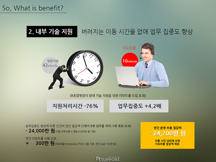 수도권의 B종합병원은 내부 지원을 위해 리모트콜을 도입해 연간 2억 4천 7백만원을 절감하고 있습니다.